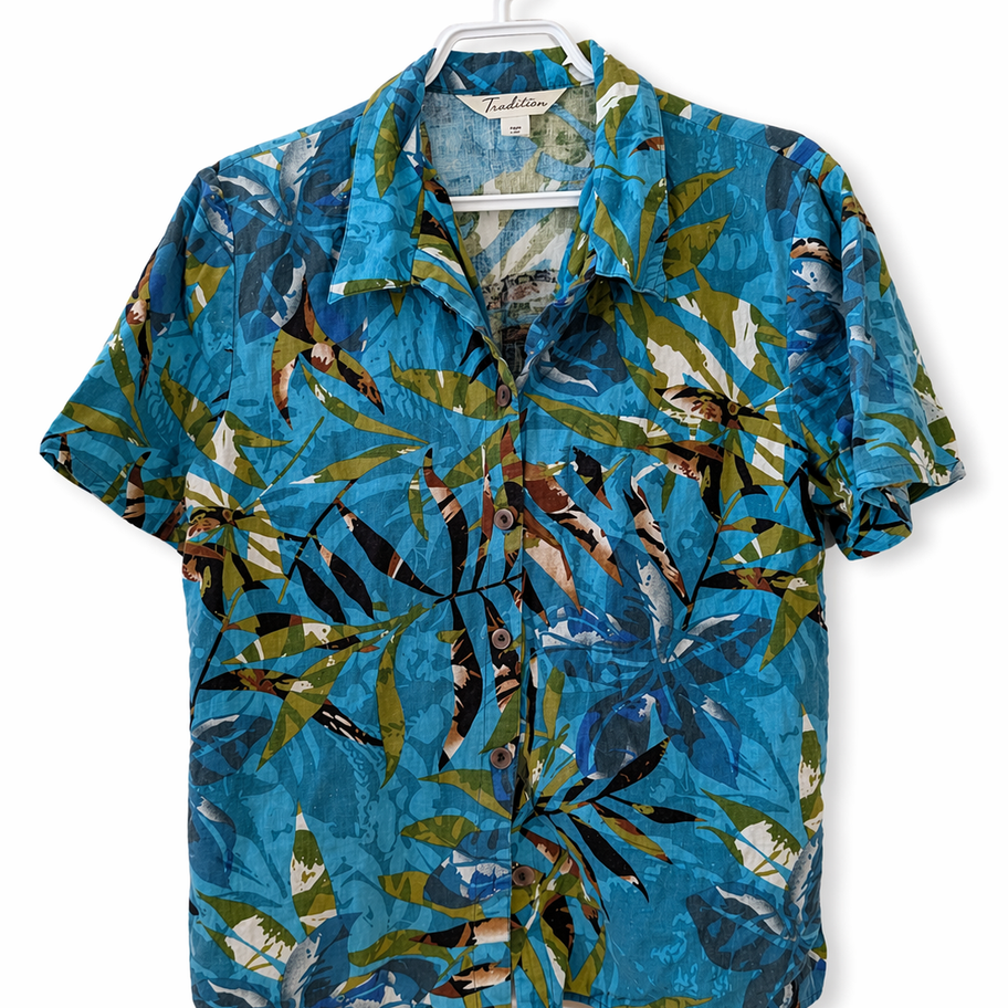 Chemise hawaïenne vintage en lin et rayonne – motif tropical bleu (XS)