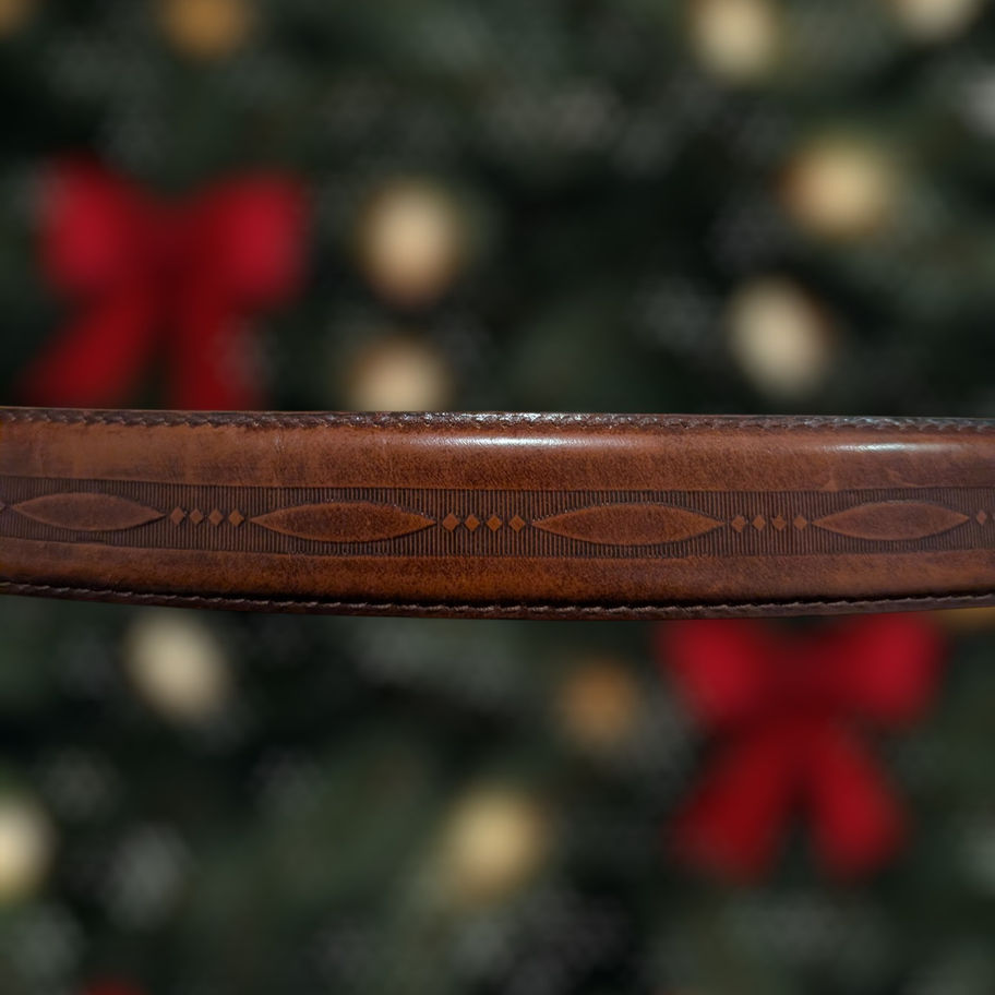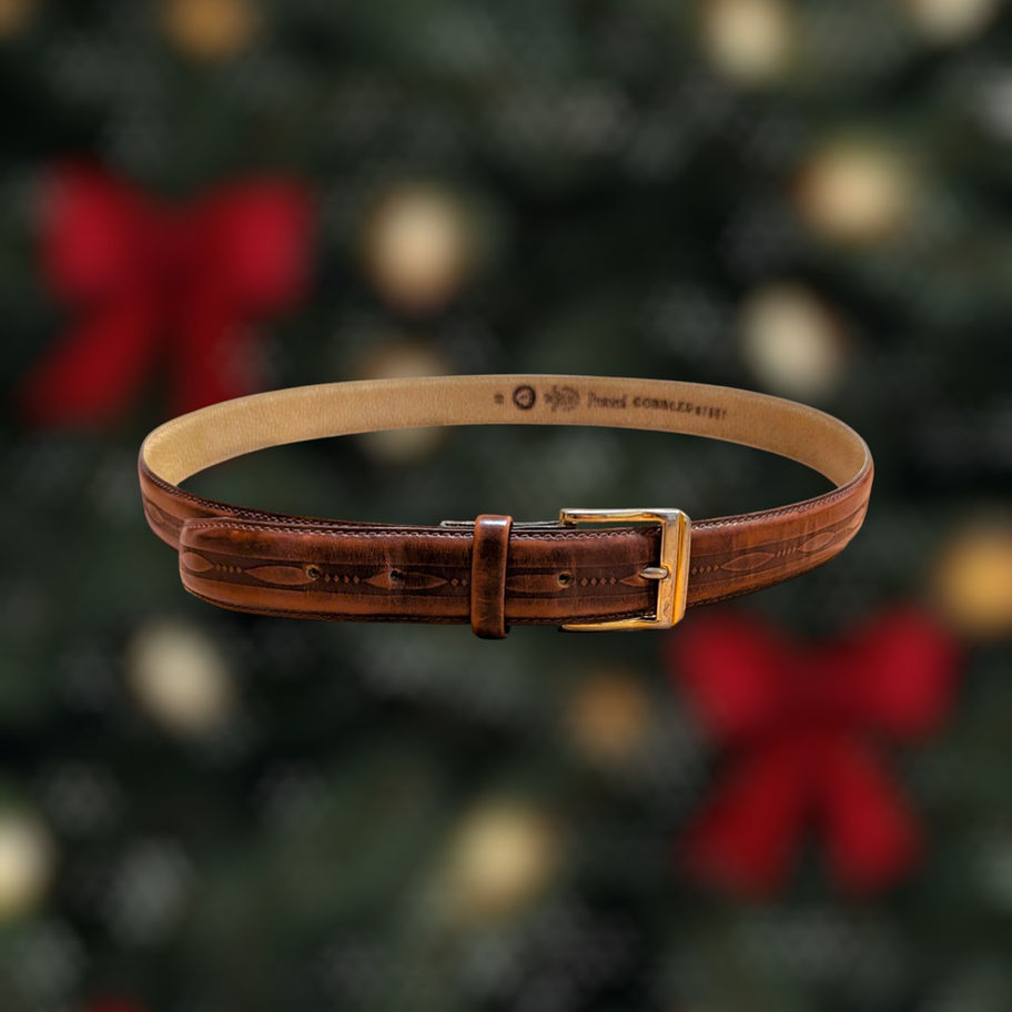 Une ceinture en cuir véritable au charme rétro signée Protocol Cobblep, parfaite pour compléter un look classique, vintage ou western chic. Son cuir brun riche est embossé d’un motif décoratif unique, typique des accessoires de qualité des années 80-90. La boucle dorée légèrement patinée donne une finition élégante et durable. Une pièce robuste, intemporelle et incroyablement stylée.