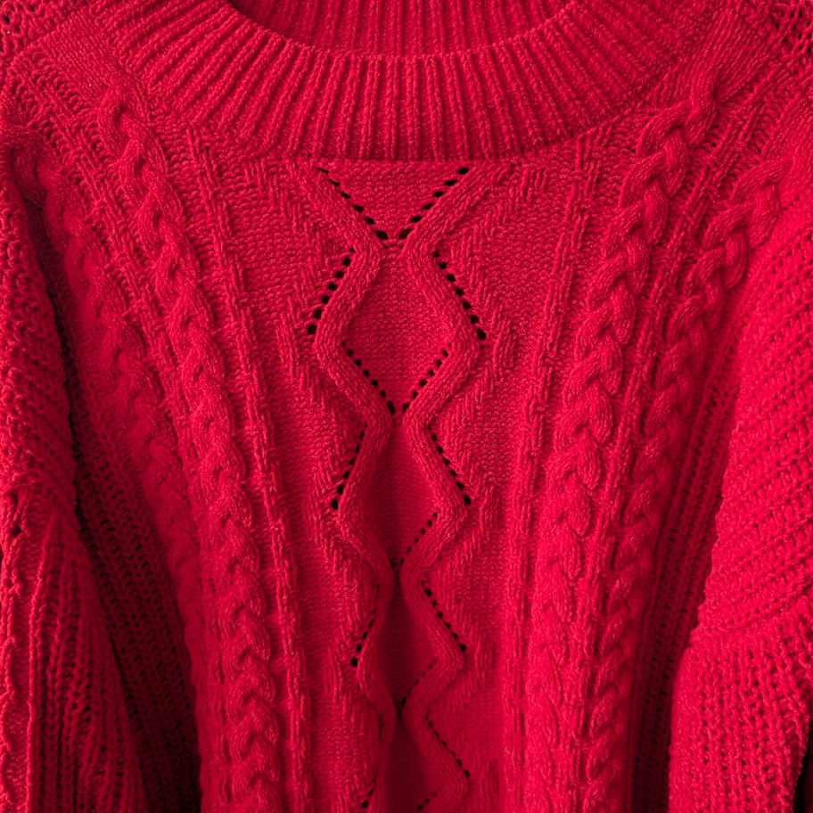 Chandail rouge vif en tricot texturé, coupe ample et super confortable. Les motifs torsadés à l’avant ajoutent une belle touche classique, tandis que la maille épaisse en fait un morceau parfait pour l’hiver. Un pull cozy, chaud et facile à styliser idéal pour un look festif, casual ou simplement pour rester bien au chaud.