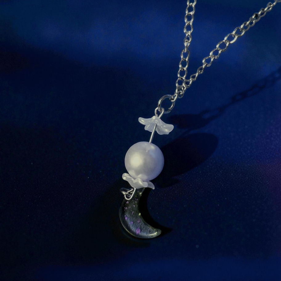 Fin et poétique, ce collier argenté combine une perle blanche et un petit croissant de lune — un bijou délicat pour les âmes rêveuses.