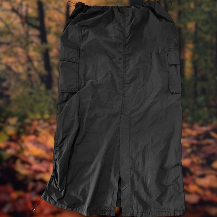 Cette jupe longue noire au style cargo combine confort et utilité avec ses poches latérales et ses cordons ajustables à la taille et à l’ourlet. Son tissu léger et légèrement froissé lui donne une allure décontractée et moderne parfaite pour un look Y2K, grunge ou minimaliste.