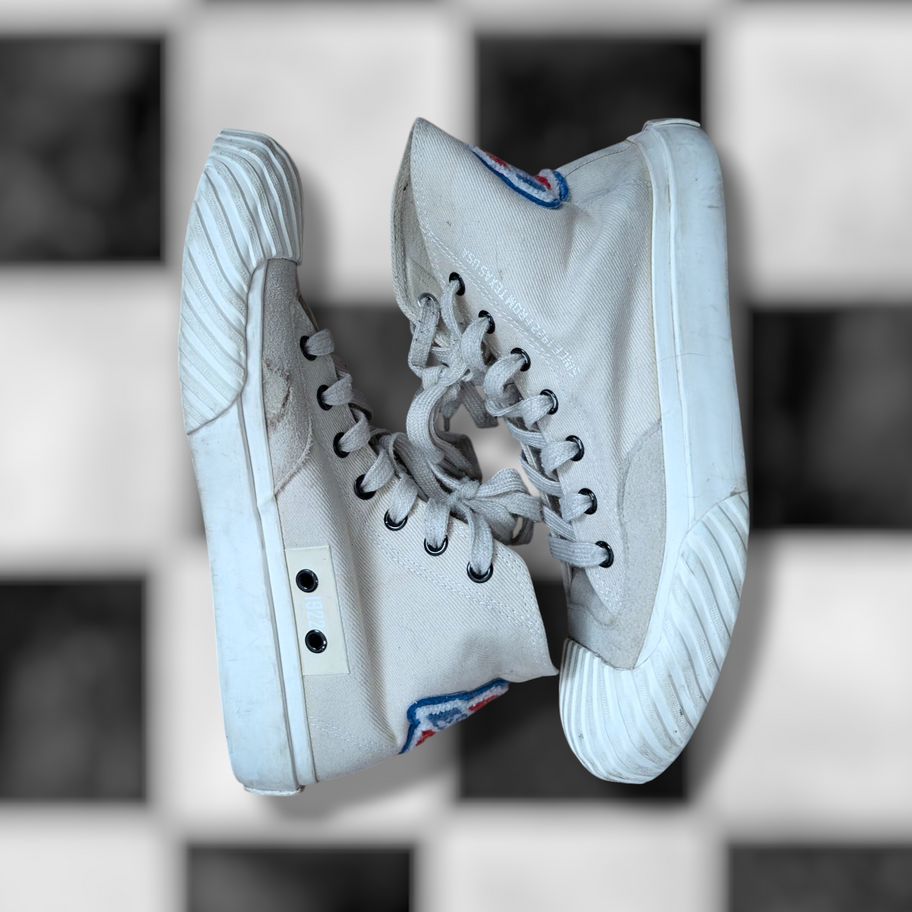 Baskets montantes Dickies blanches, au look vintage affirmé, avec logo brodé oversize en bouclette multicolore au dos. Fabriquées en toile résistante avec embout en caoutchouc texturé. Un petit accroc a été discrètement réparé sur le côté intérieur (voir dernière photo), sans incidence sur le confort ou la durabilité.