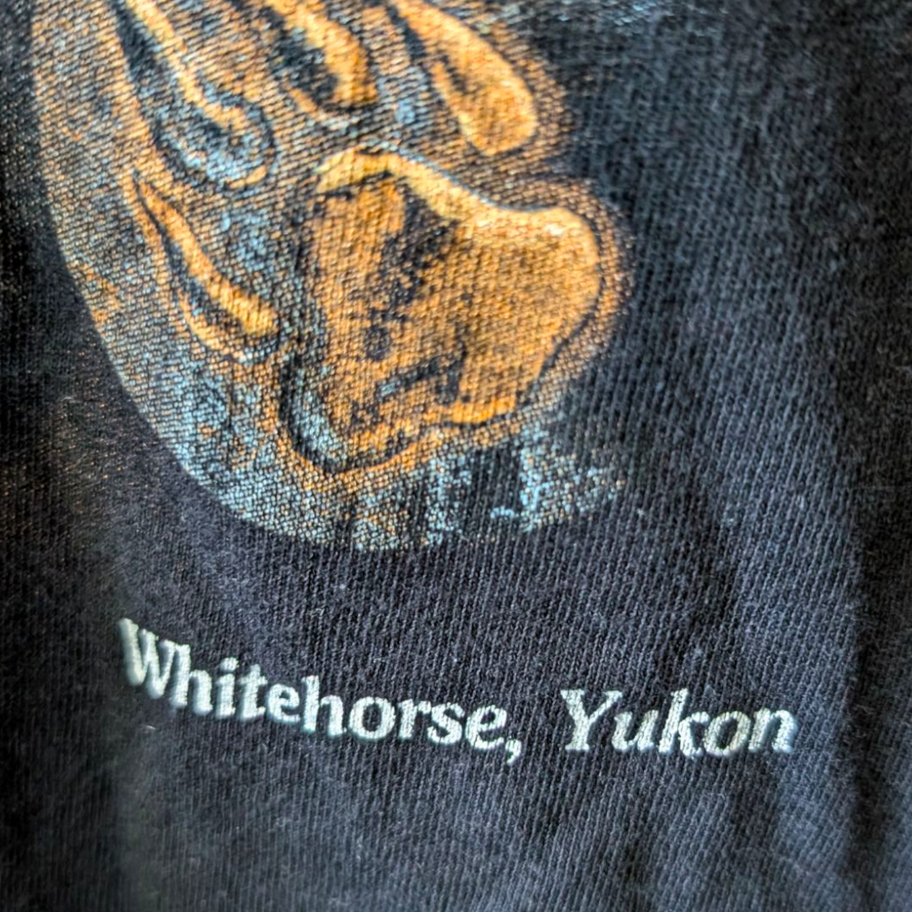 T-shirt noir de style touristique animalier, avec un visuel saisissant de trois loups réalistes, dont un au centre en couleur chaude, entouré de deux autres en tons froids. On y retrouve l’inscription "Whitehorse, Yukon", typique des boutiques de souvenirs du Nord canadien.